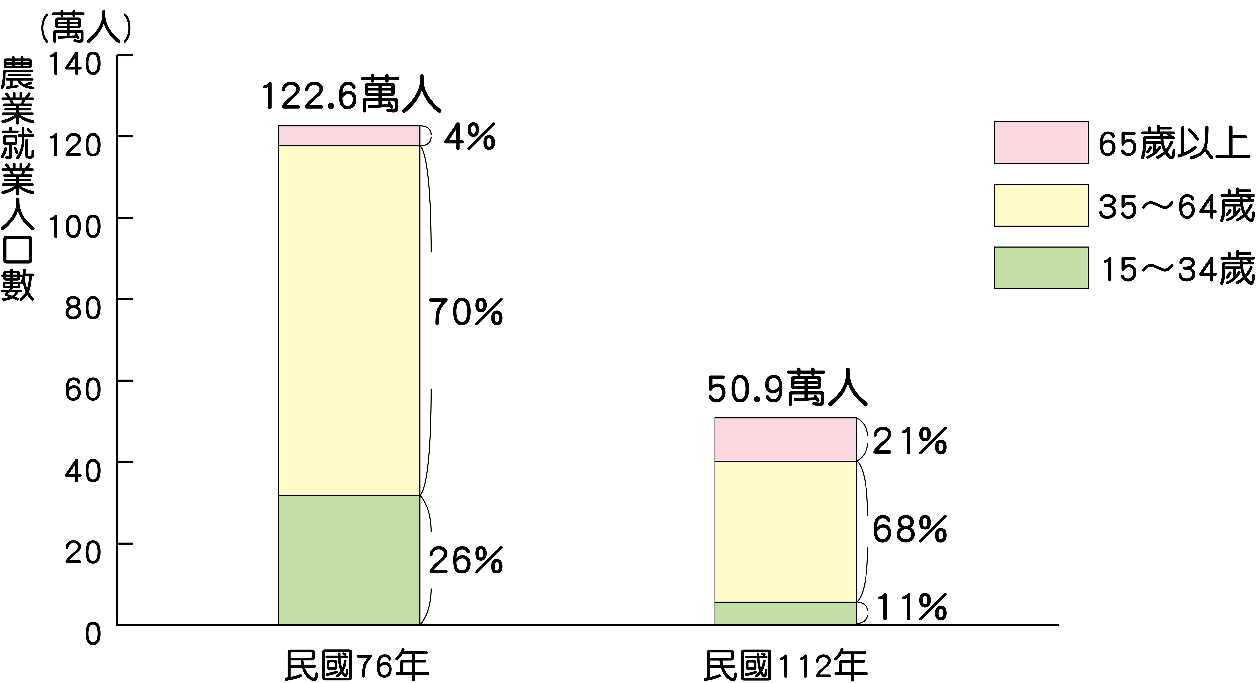1-3-11_ 臺灣的農業就業人口數與年齡比例圖(民國76年和民國112年)