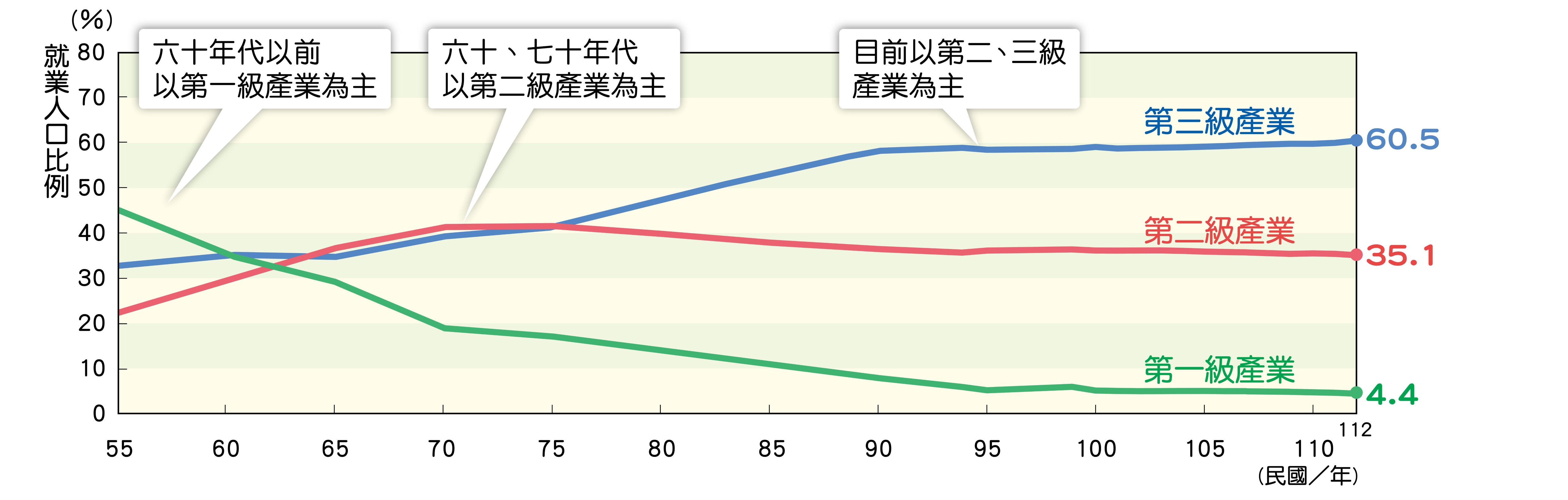 1-3-04_臺灣歷年三級產業的就業人口比例變化圖(民國55-112年)