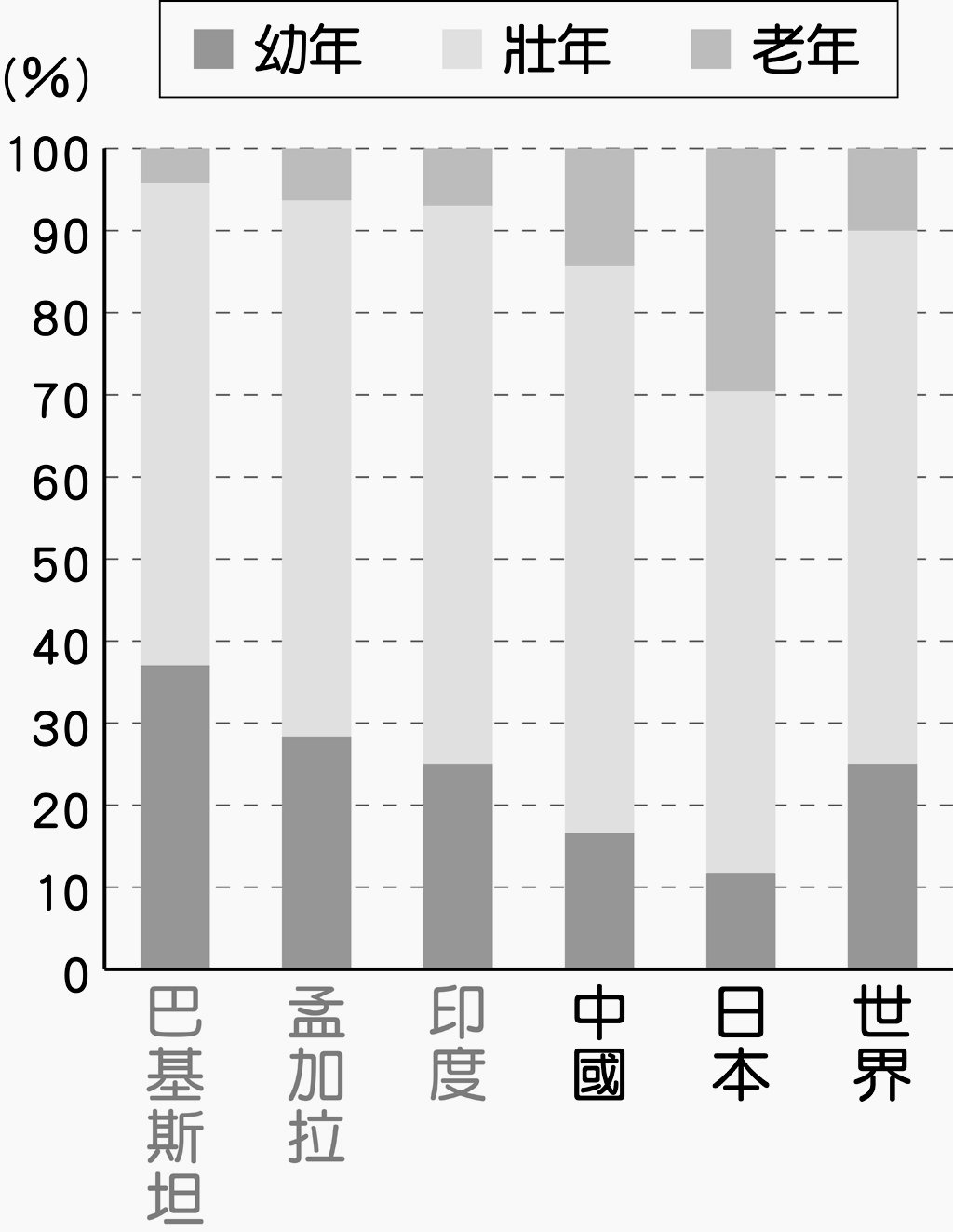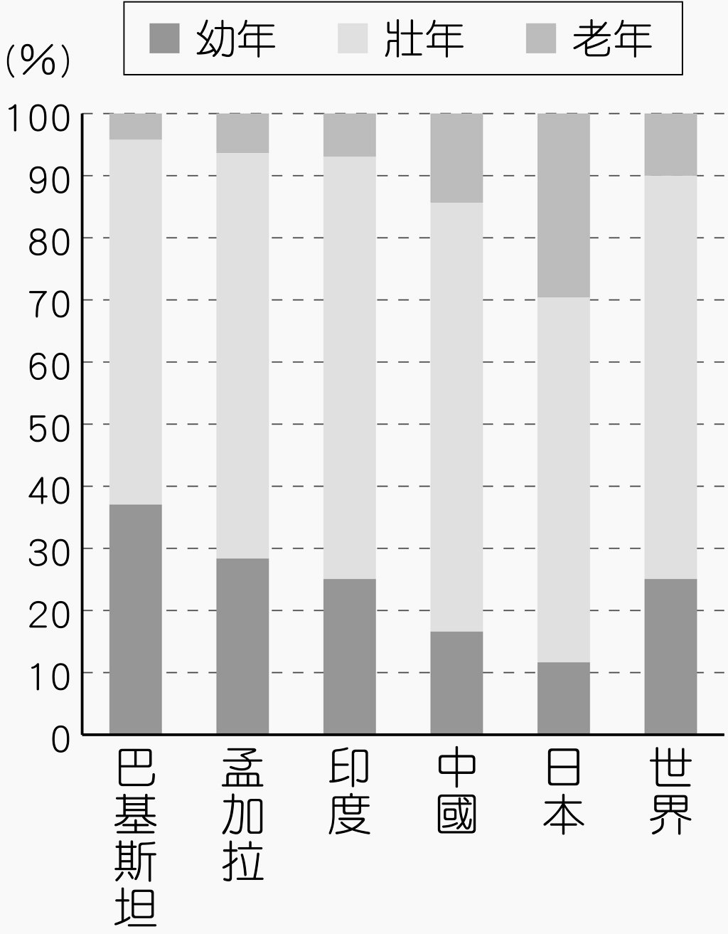 1-2-21_南亞三國與亞洲主要國家人口年齡結構比較圖(西元2023年)