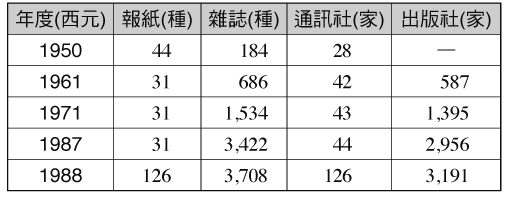 西元1950-1988年間臺灣核准登記媒體家數統計表