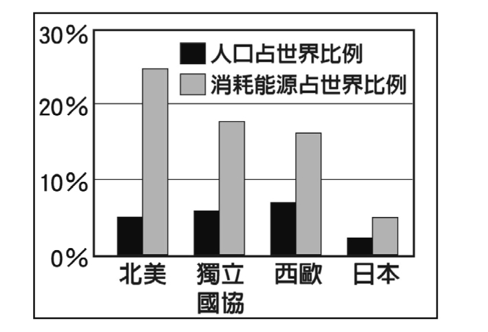 四個地區的人口及能源消耗比例圖