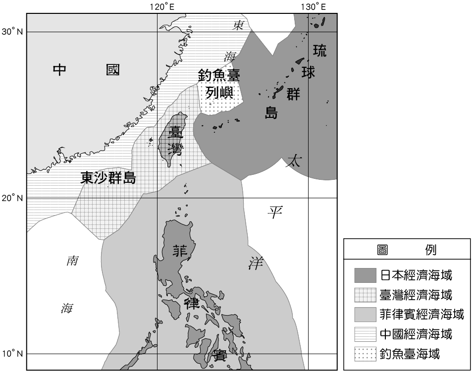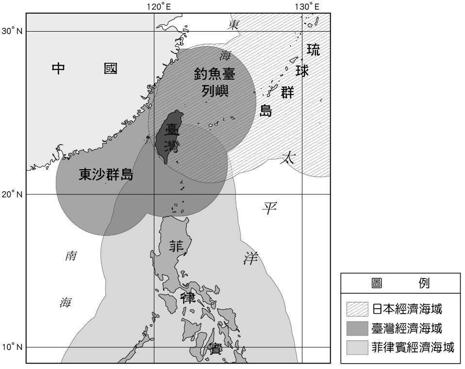 臺灣與鄰國依200浬規定劃分的經濟海域分布示意圖